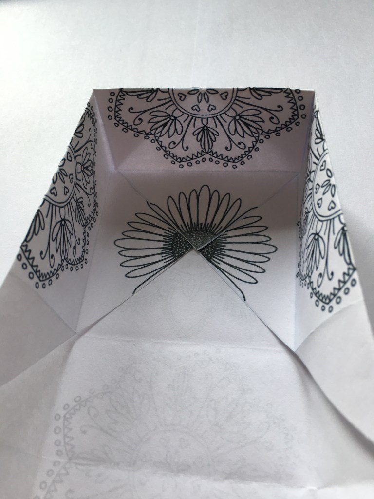 - Fold the corner down to the middle to hold the sides of the box in place.