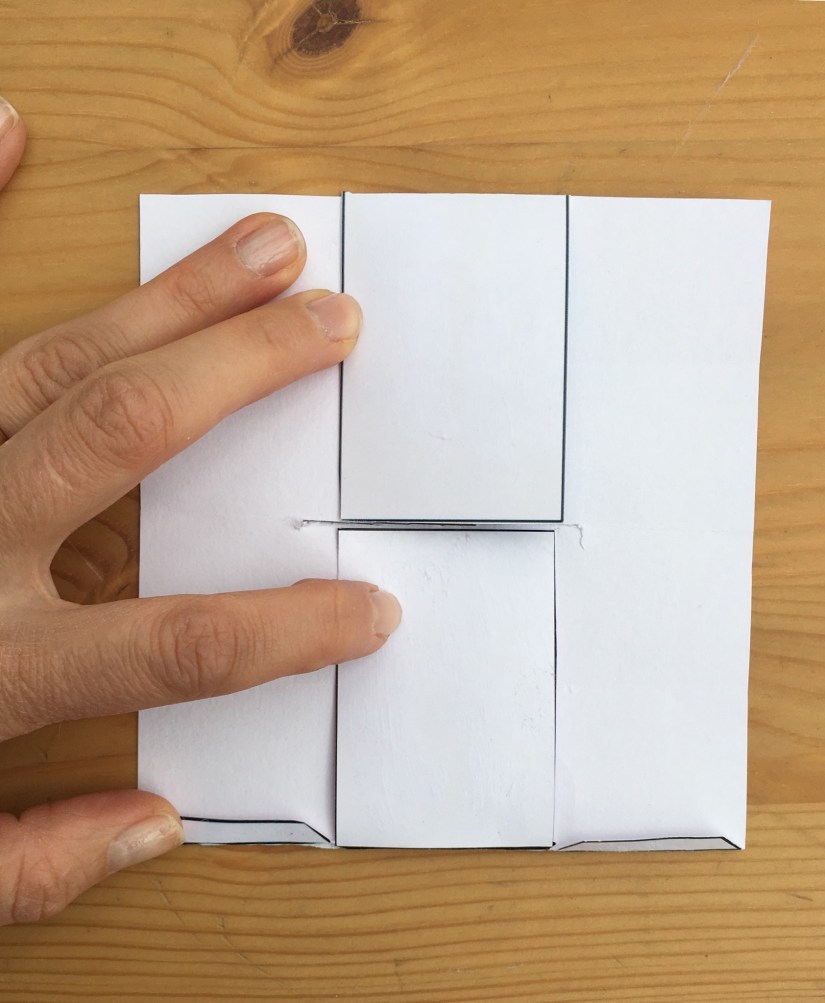 6. Put glue on the rectangles and the tabs and fold the main piece in half horizontally so that the rectangles are attached to each other and the tabs are stuck to the opposite side of the main piece.