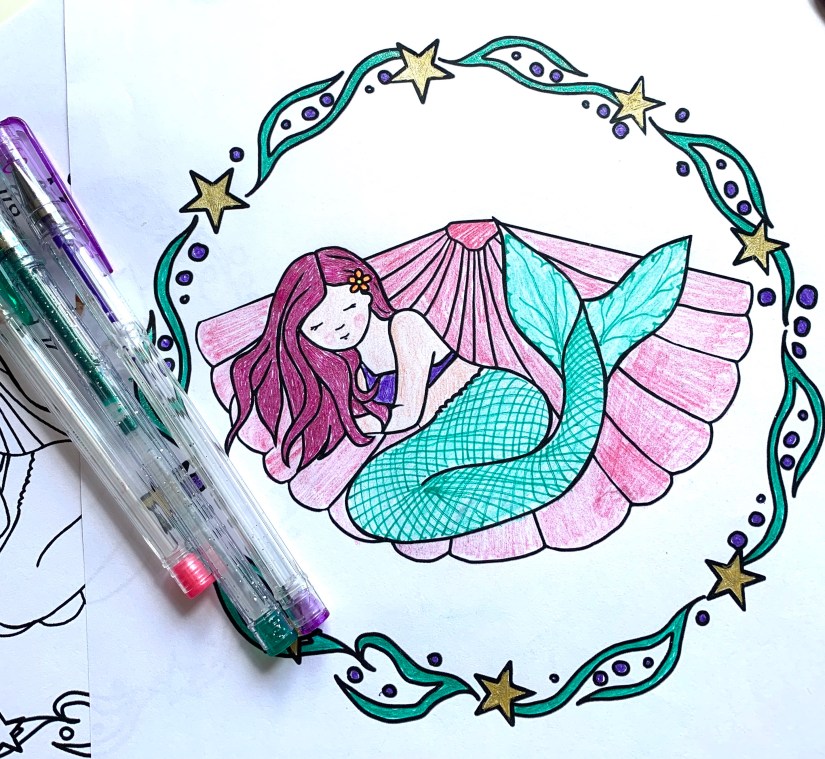 This colouring page was a request from my daughter. She wanted a mermaid sleeping in a shell so here we are – a pretty little colouring page to start the summer holidays with. We are really enjoying doing our colouring with gel markers at the moment. The glittery and shimmery ones really make projects stand out. My nine year old daughter recommends the W H Smiths ones.