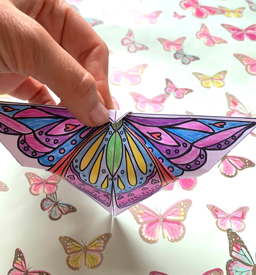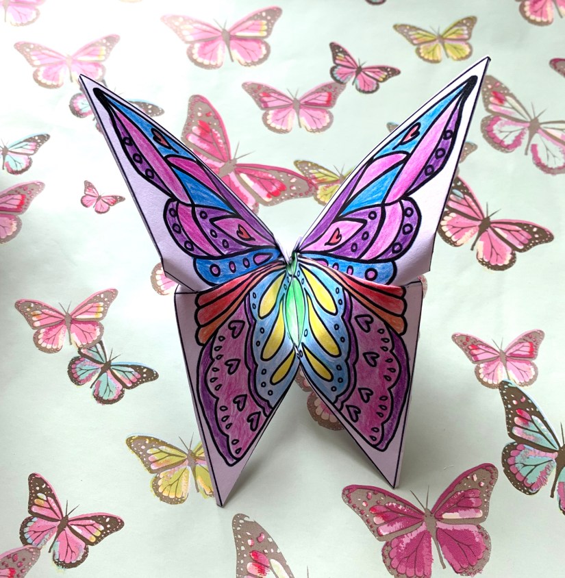 11. Fold the butterfly in half with the coloured sides on the inside and then gently open to reveal your finished butterfly.
