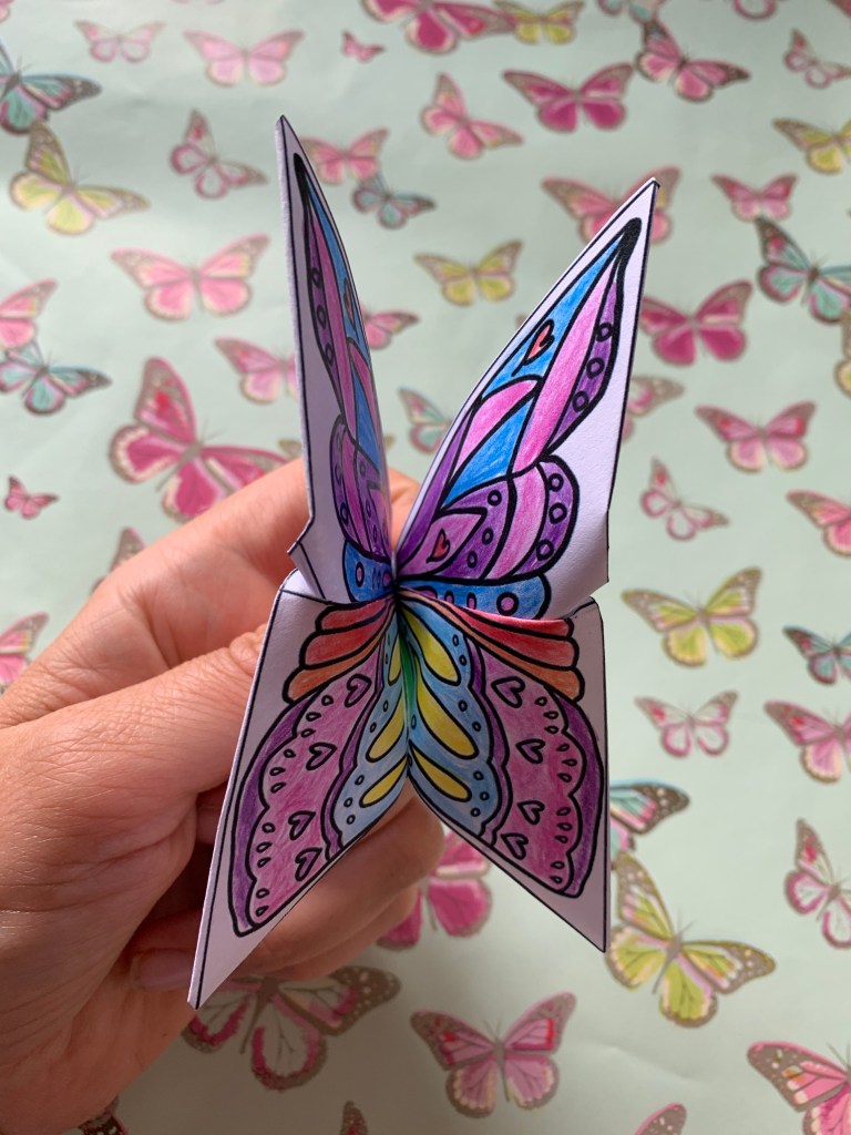 This is a lovely project to make with children. They can colour the butterfly in and then you can learn how to fold the origami butterflies together. They make lovely decorations when you are wrapping gifts or why not turn them into a pretty mobile or bunting?